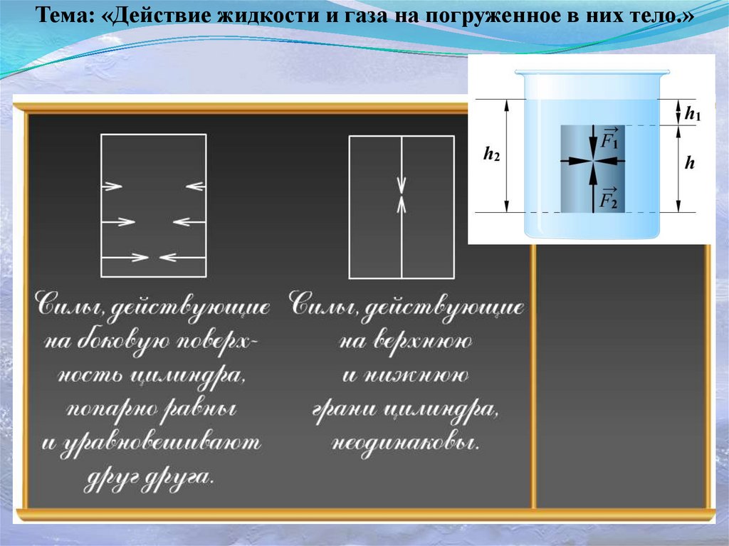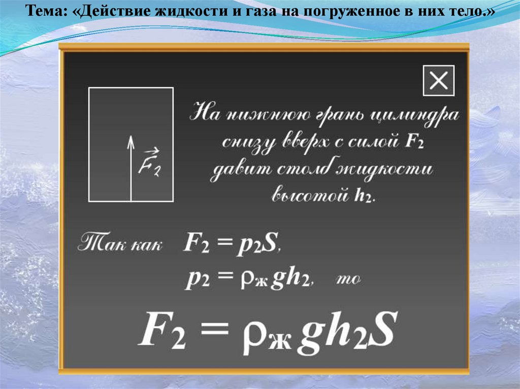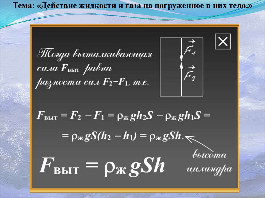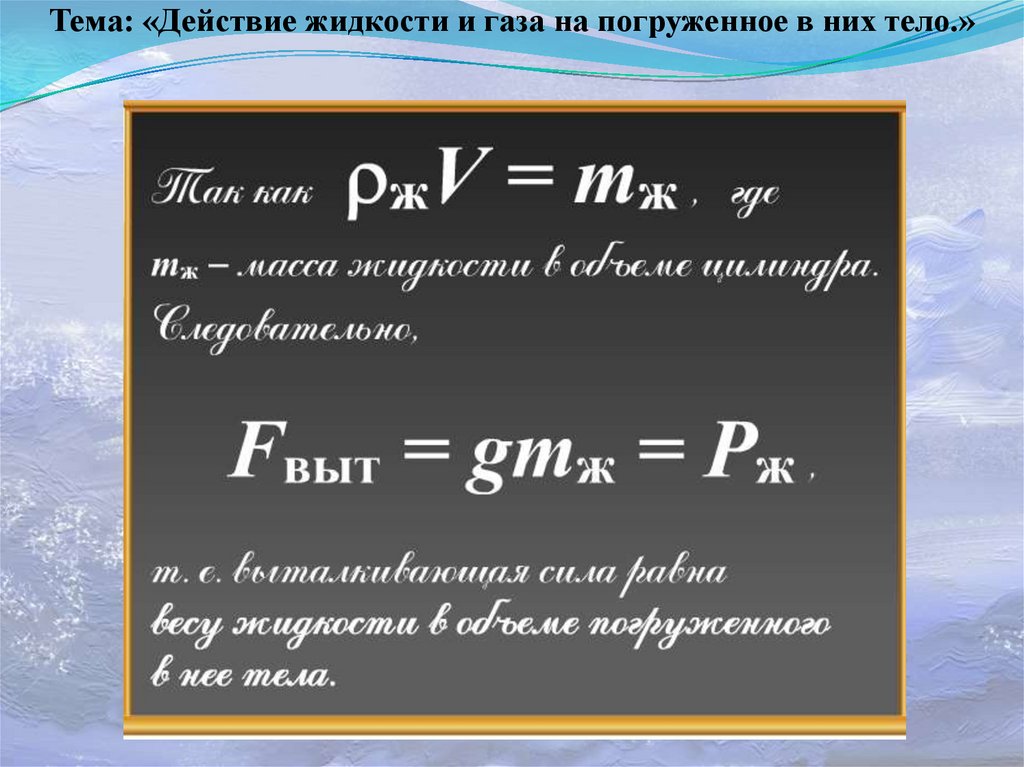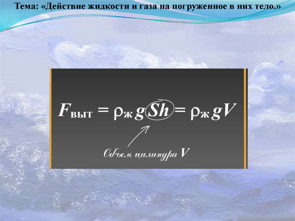 Тема: «Действие жидкости и газа на погруженное в них тело.»Рассчитаем выталкивающую силу, действующую
