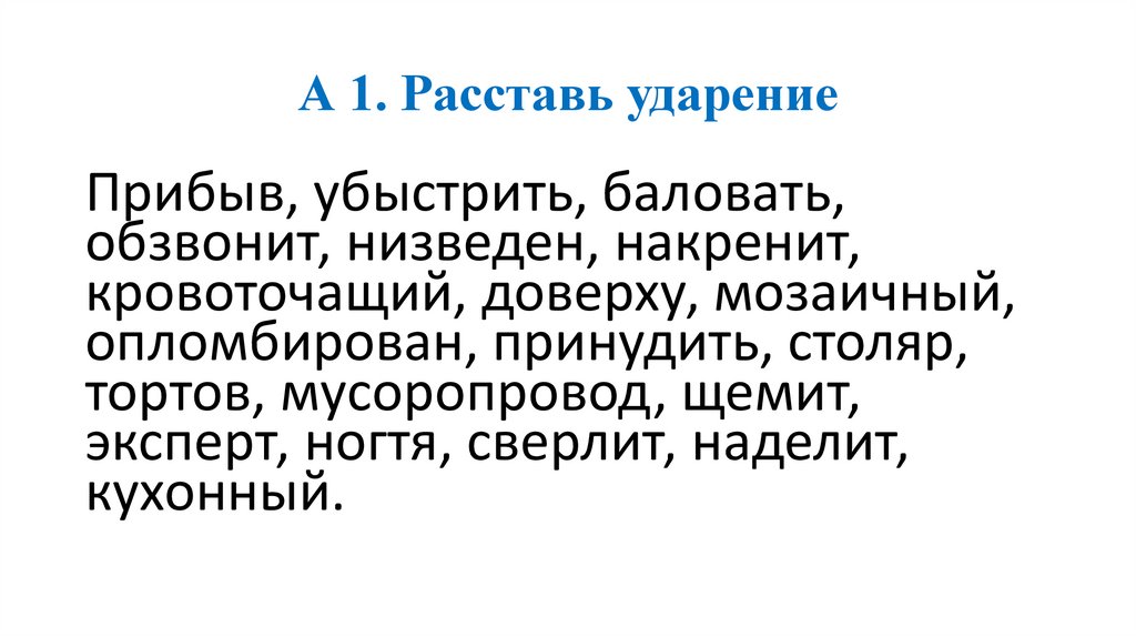 А 1. Расставь ударениеПрибыв, убыстрить, баловать,