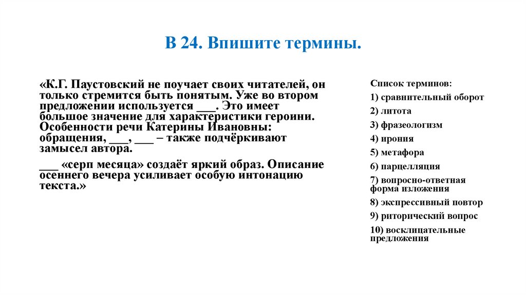 В 24. Впишите термины.«К.Г. Паустовский не поучает своих читателей, он