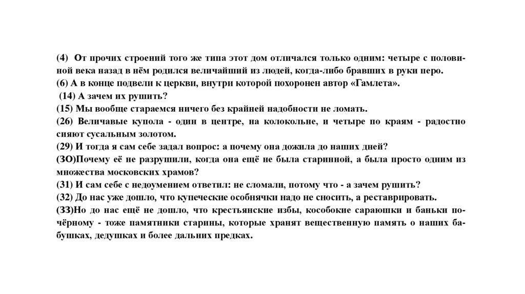 (4) От прочих строений того же типа этот дом отличался только одним: четыре с половиной века назад в нём родился величайший из людей, когда-либо бравших в руки перо.(6) А в конце подвели к церкви, внутри которой похоронен автор «Гамлета».