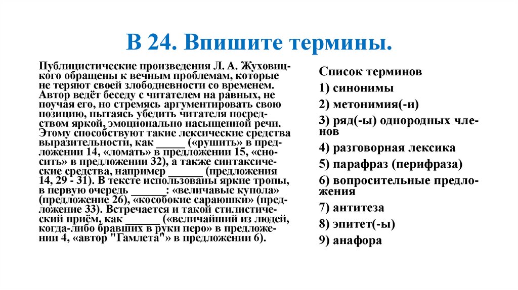 В 24. Впишите термины.Публицистические произведения Л. A. Жуховицкого обращены к вечным проблемам, которые