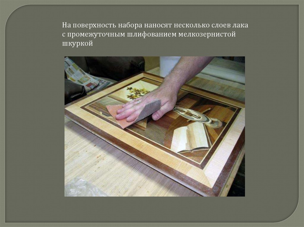 На поверхность набора наносят несколько слоев лакас промежуточным шлифованием мелкозернистой