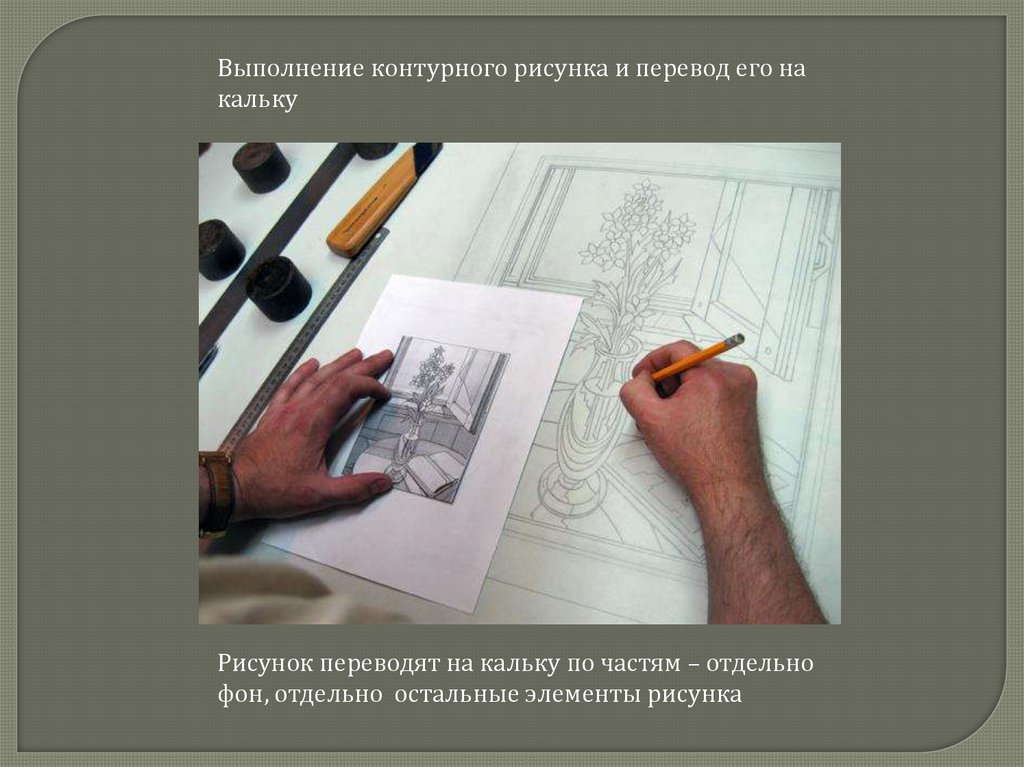 Рисунок переводят на кальку по частям – отдельно