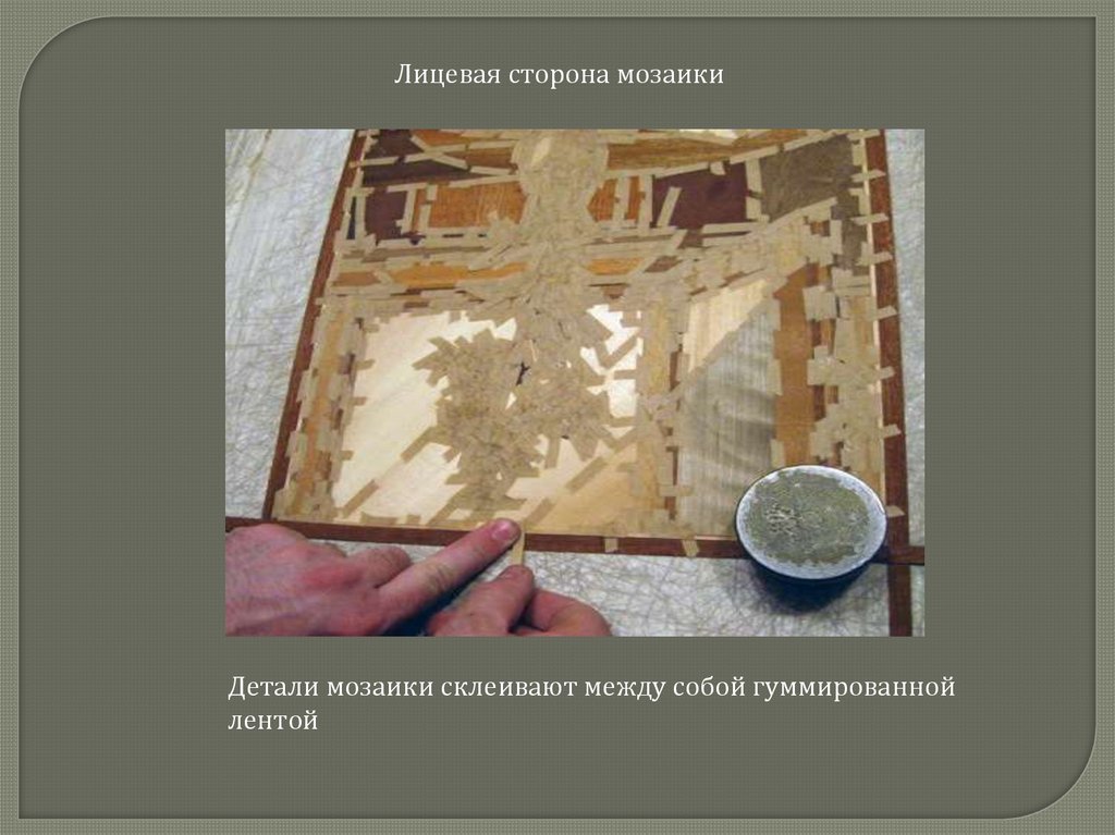 Лицевая сторона мозаикиДетали мозаики склеивают между собой гуммированной