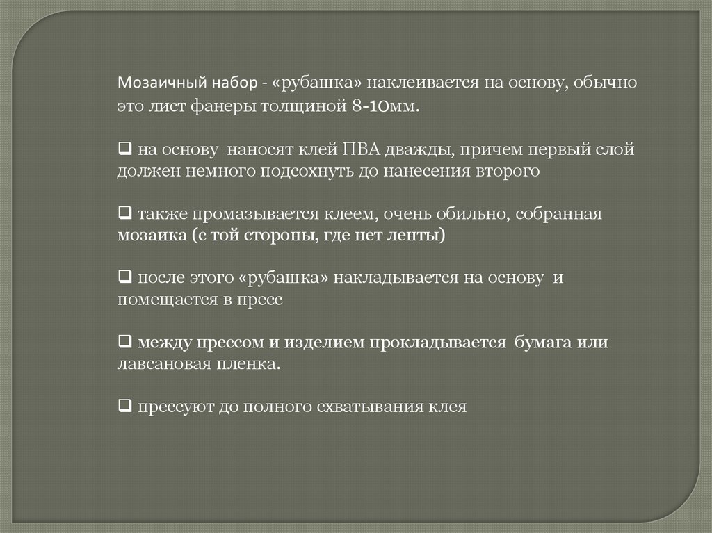 Мозаичный набор - «рубашка» наклеивается на основу, обычноэто лист фанеры толщиной 8-10мм.