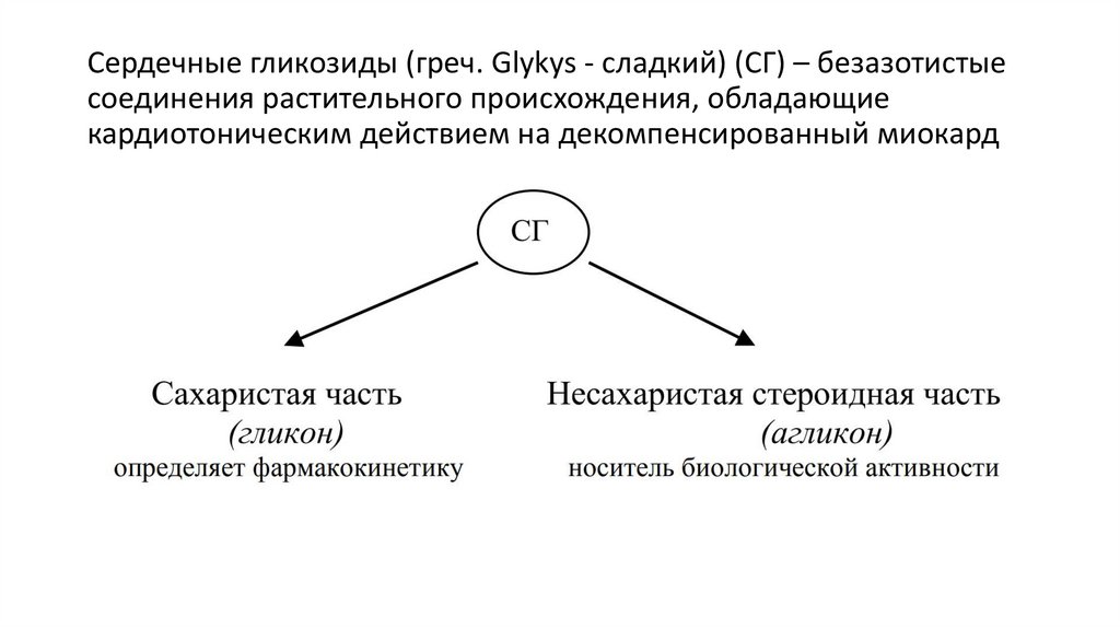 Сердечные гликозиды (греч. Glykys - сладкий) (СГ) – безазотистыесоединения растительного происхождения, обладающие