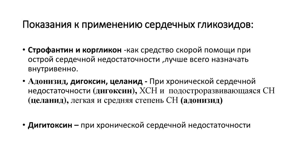 Показания к применению сердечных гликозидов:• Строфантин и коргликон -как средство скорой помощи при