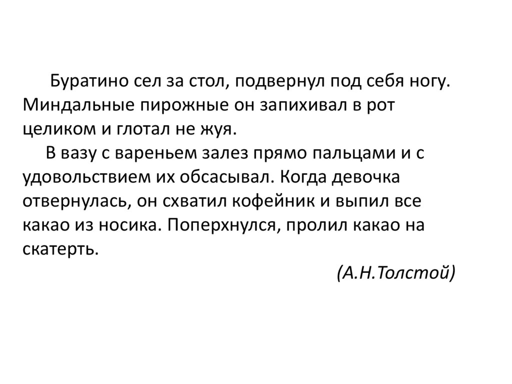 Буратино сел за стол, подвернул под себя ногу.Миндальные пирожные он запихивал в рот