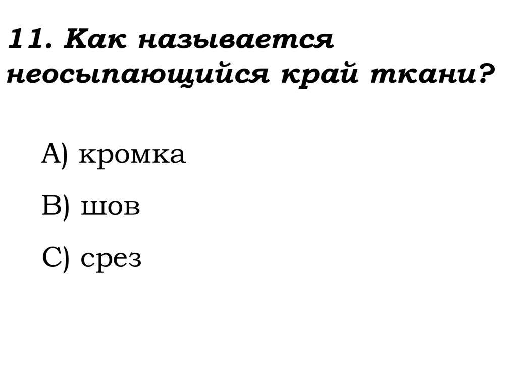 11. Как называетсянеосыпающийся край ткани?
