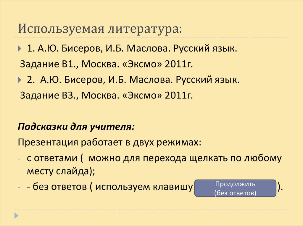 Используемая литература:1. А.Ю. Бисеров, И.Б. Маслова. Русский язык.