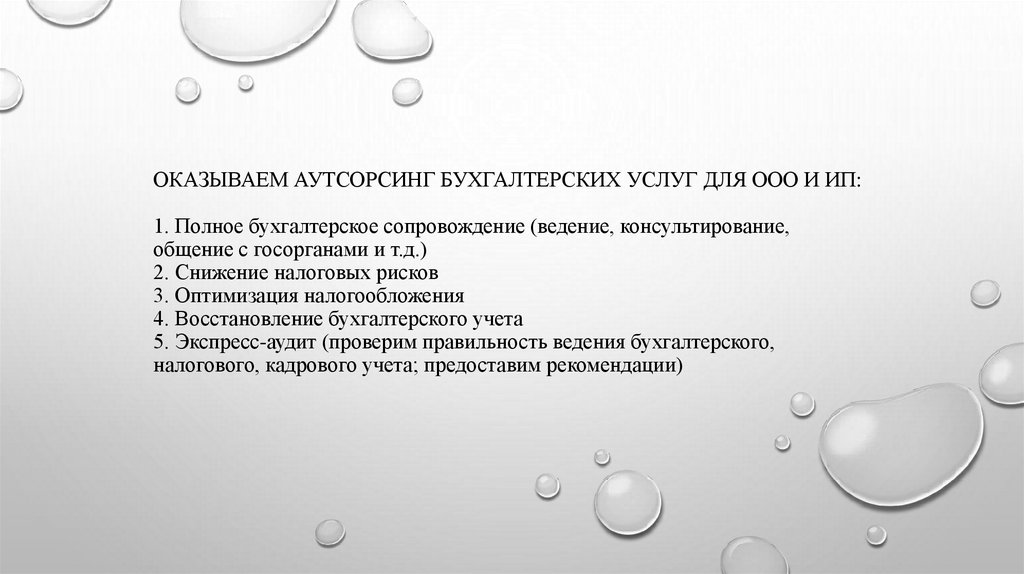 ОКАЗЫВАЕМ АУТСОРСИНГ БУХГАЛТЕРСКИХ УСЛУГ ДЛЯ ООО И ИП:1. Полное бухгалтерское сопровождение (ведение, консультирование,