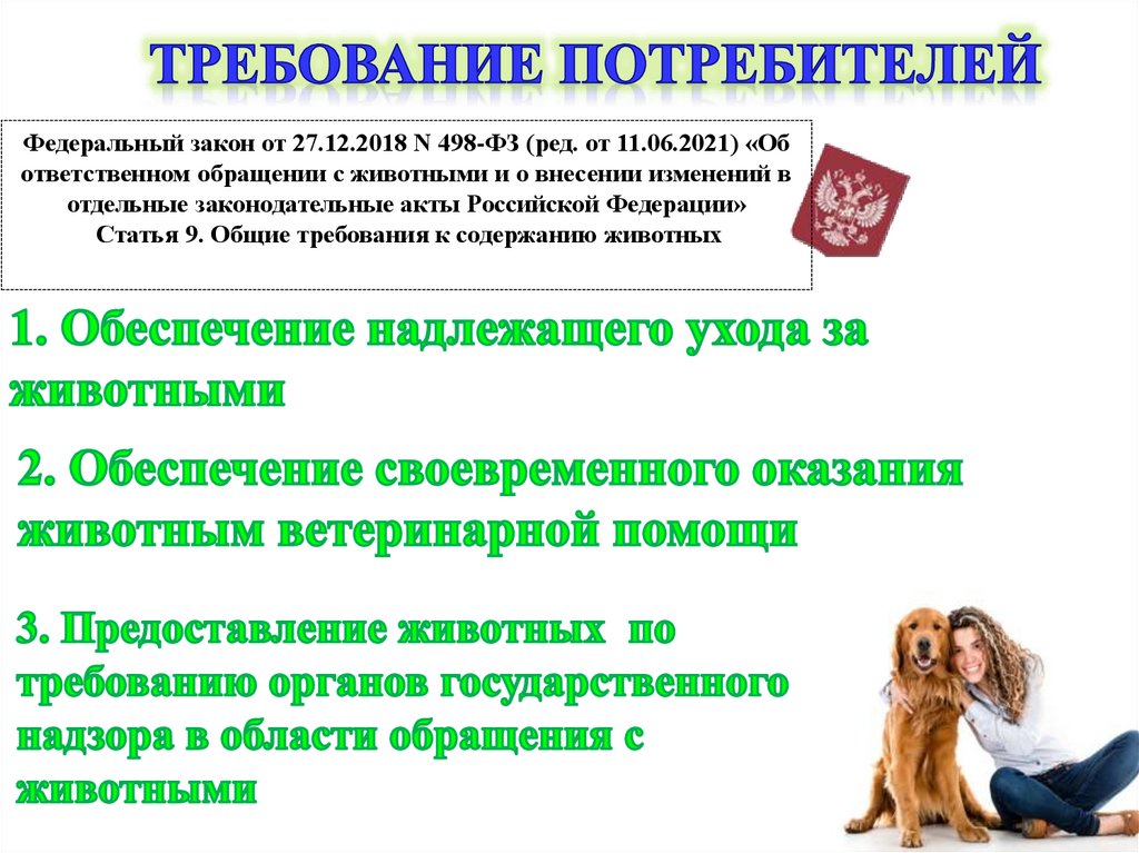 Федеральный закон от 27.12.2018 N 498-ФЗ (ред. от 11.06.2021) «Обответственном обращении с животными и о внесении изменений в