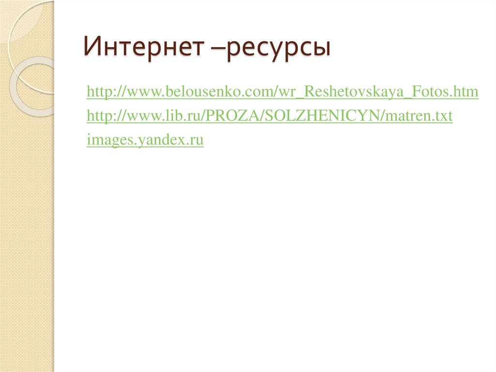 Интернет –ресурсыhttp://www.belousenko.com/wr_Reshetovskaya_Fotos.htm