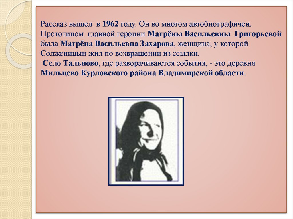 Рассказ вышел в 1962 году. Он во многом автобиографичен.Прототипом главной героини Матрёны Васильевны Григорьевой