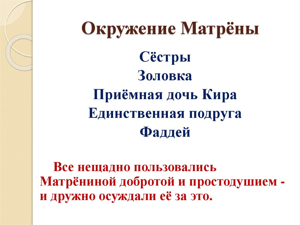 Матрёниной добротой и простодушием и дружно осуждали её за это.