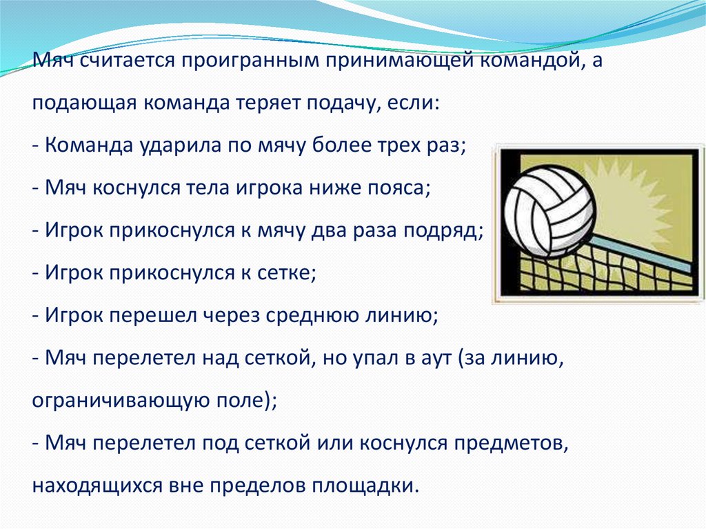 Мяч считается проигранным принимающей командой, аподающая команда теряет подачу, если: