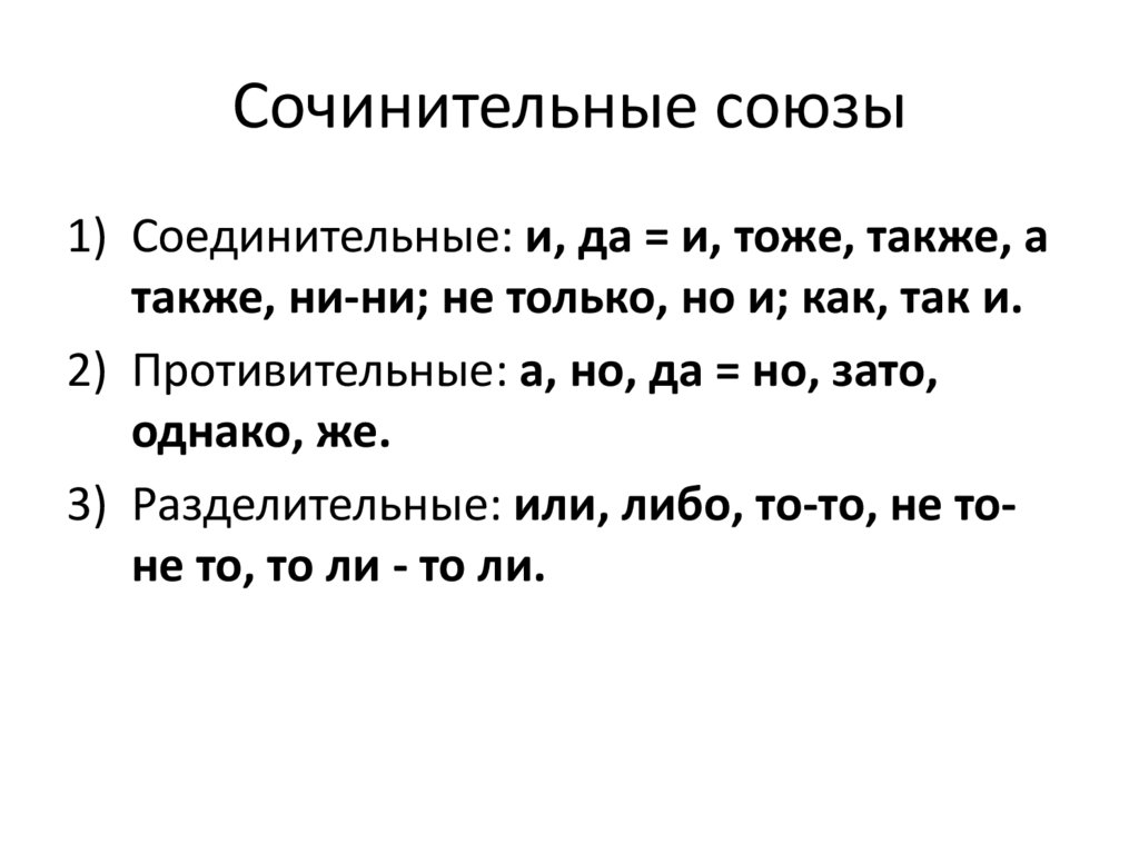 Сочинительные союзы1) Соединительные: и, да = и, тоже, также, а