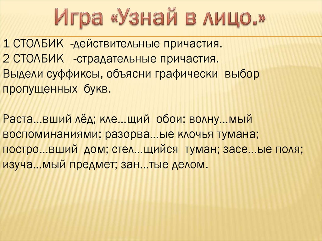 1 СТОЛБИК -действительные причастия.2 СТОЛБИК -страдательные причастия.