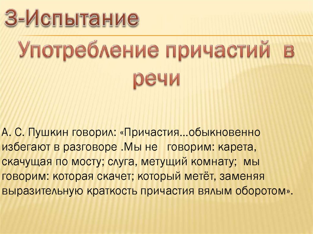 А. С. Пушкин говорил: «Причастия…обыкновенноизбегают в разговоре .Мы не говорим: карета,