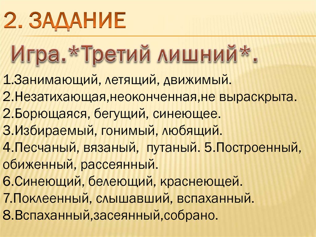4.Песчаный, вязаный, путаный. 5.Построенный,