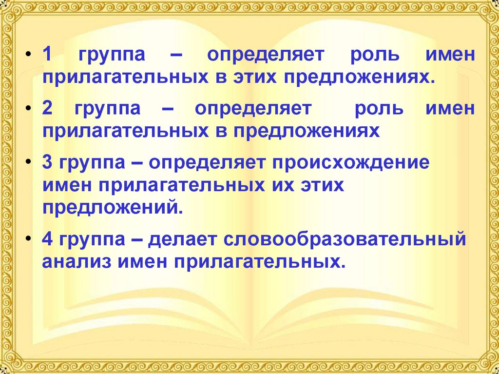 • 1 группа – определяет роль именприлагательных в этих предложениях.