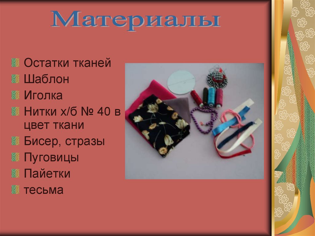 Для шитья годятся почти все ткани,кроме толстых и тяжелых.