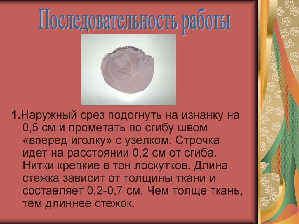 1.Наружный срез подогнуть на изнанку на0,5 см и прометать по сгибу швом