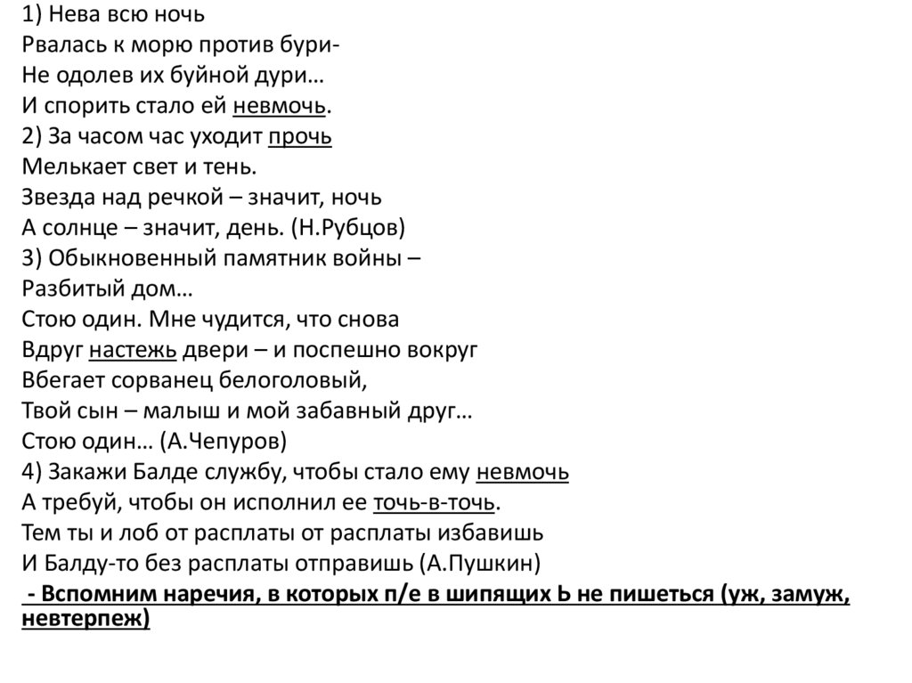 - Вспомним наречия, в которых п/е в шипящих Ь не пишеться (уж, замуж,
