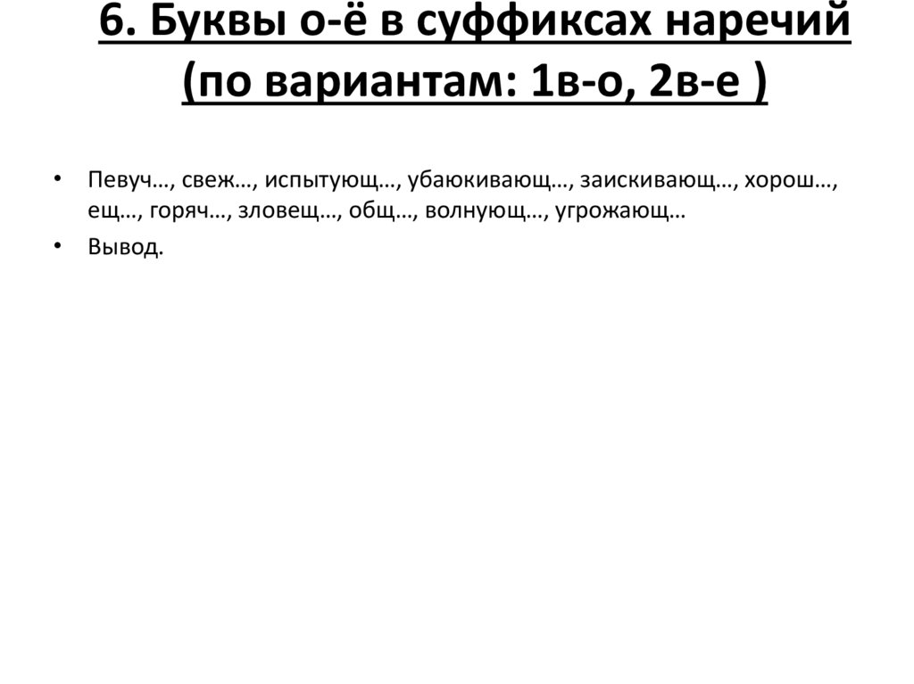 6. Буквы о-ё в суффиксах наречий(по вариантам: 1в-о, 2в-е )