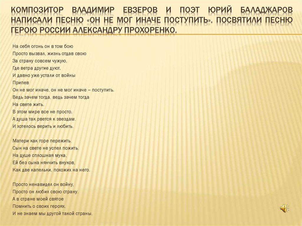 КОМПОЗИТОР ВЛАДИМИР ЕВЗЕРОВ И ПОЭТ ЮРИЙ БАЛАДЖАРОВНАПИСАЛИ ПЕСНЮ «ОН НЕ МОГ ИНАЧЕ ПОСТУПИТЬ». ПОСВЯТИЛИ ПЕСНЮ