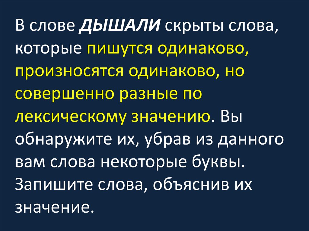 В слове ДЫШАЛИ скрыты слова,которые пишутся одинаково,