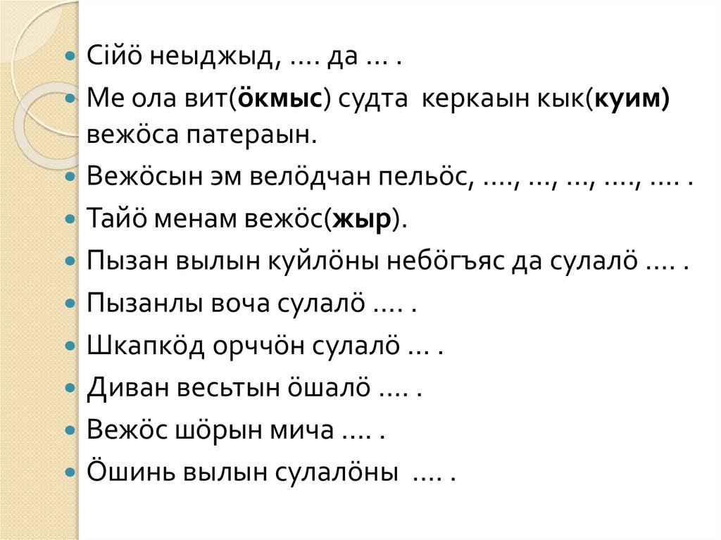 Вежöсын эм велöдчан пельöс, …., …, …, …., …. .