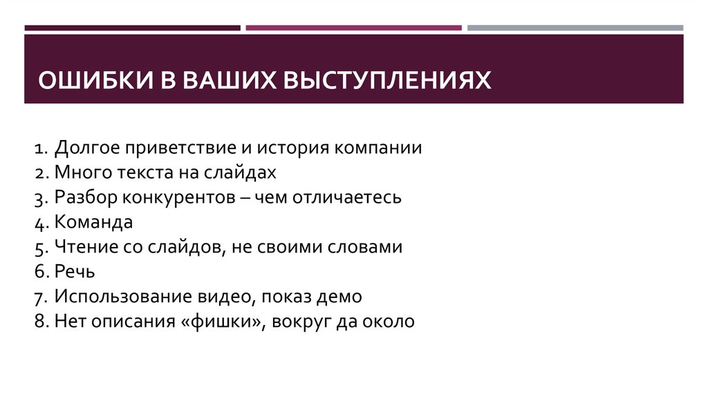 ОШИБКИ В ВАШИХ ВЫСТУПЛЕНИЯХ1. Долгое приветствие и история компании