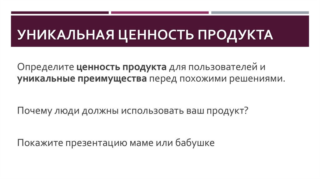 УНИКАЛЬНАЯ ЦЕННОСТЬ ПРОДУКТАОпределите ценность продукта для пользователей и