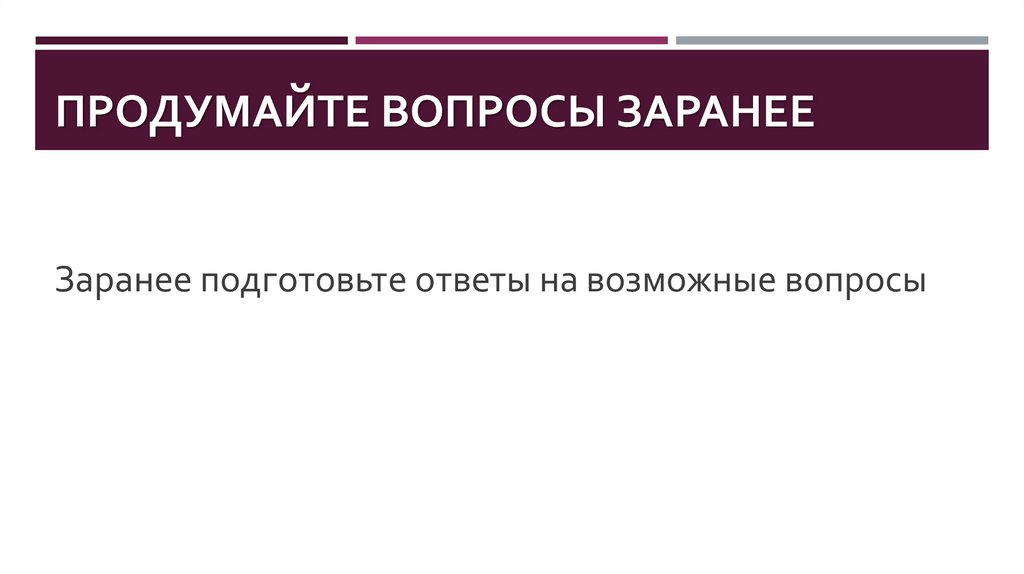 ПРОДУМАЙТЕ ВОПРОСЫ ЗАРАНЕЕЗаранее подготовьте ответы на возможные вопросы