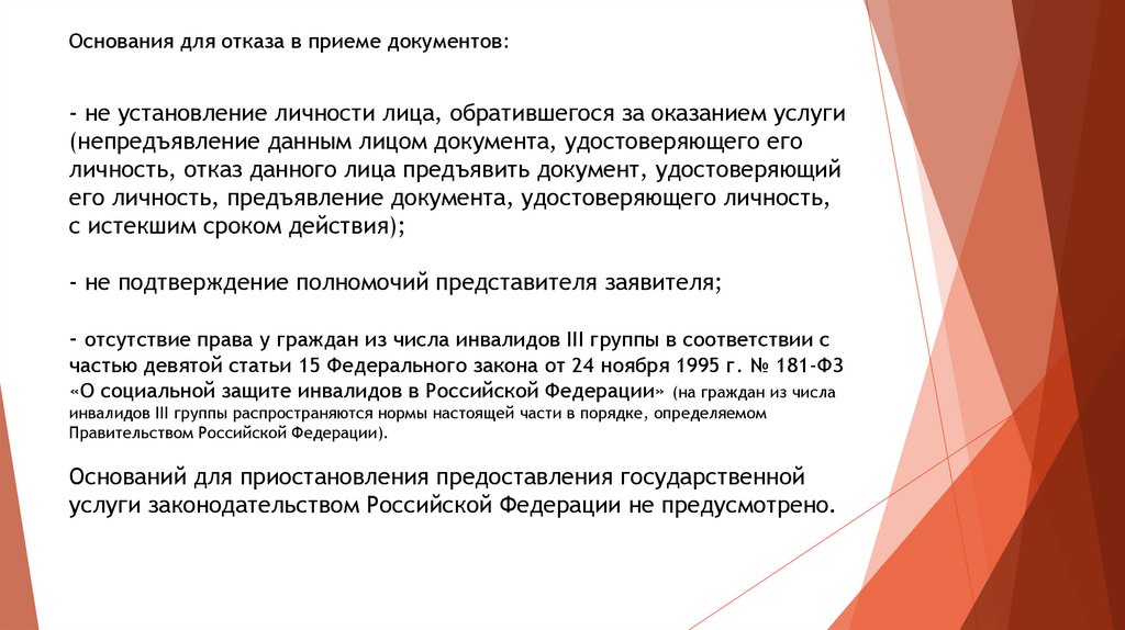 Основания для отказа в приеме документов:- не установление личности лица, обратившегося за оказанием услуги