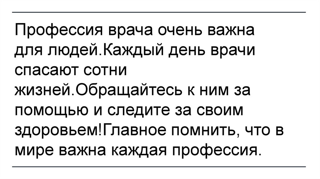 Профессия врача очень важнадля людей.Каждый день врачи