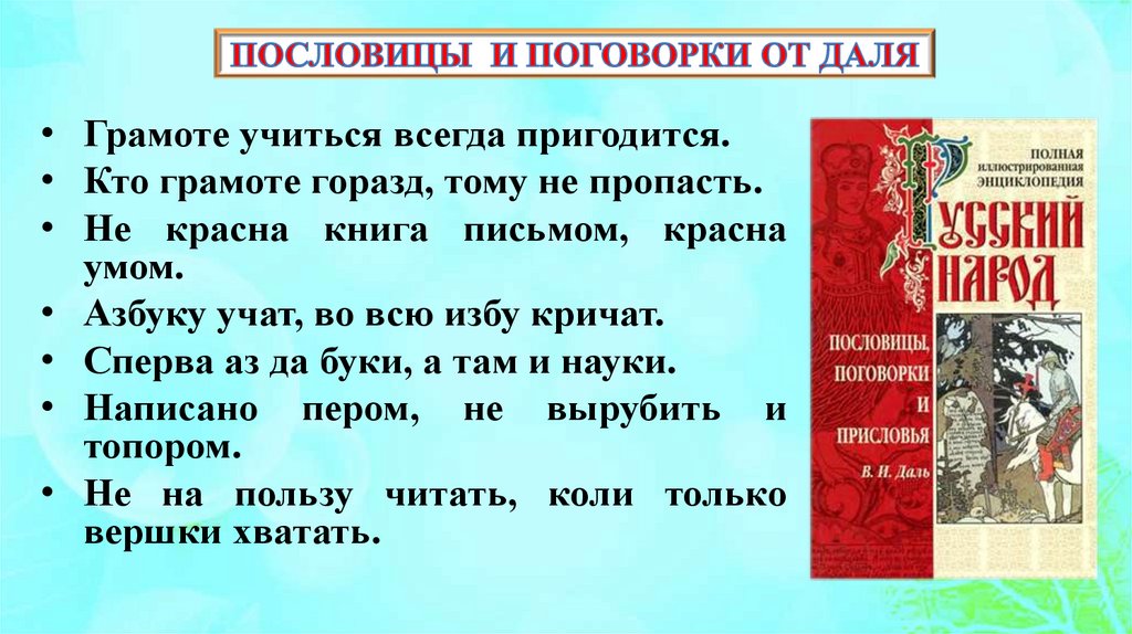 • Грамоте учиться всегда пригодится.• Кто грамоте горазд, тому не пропасть.