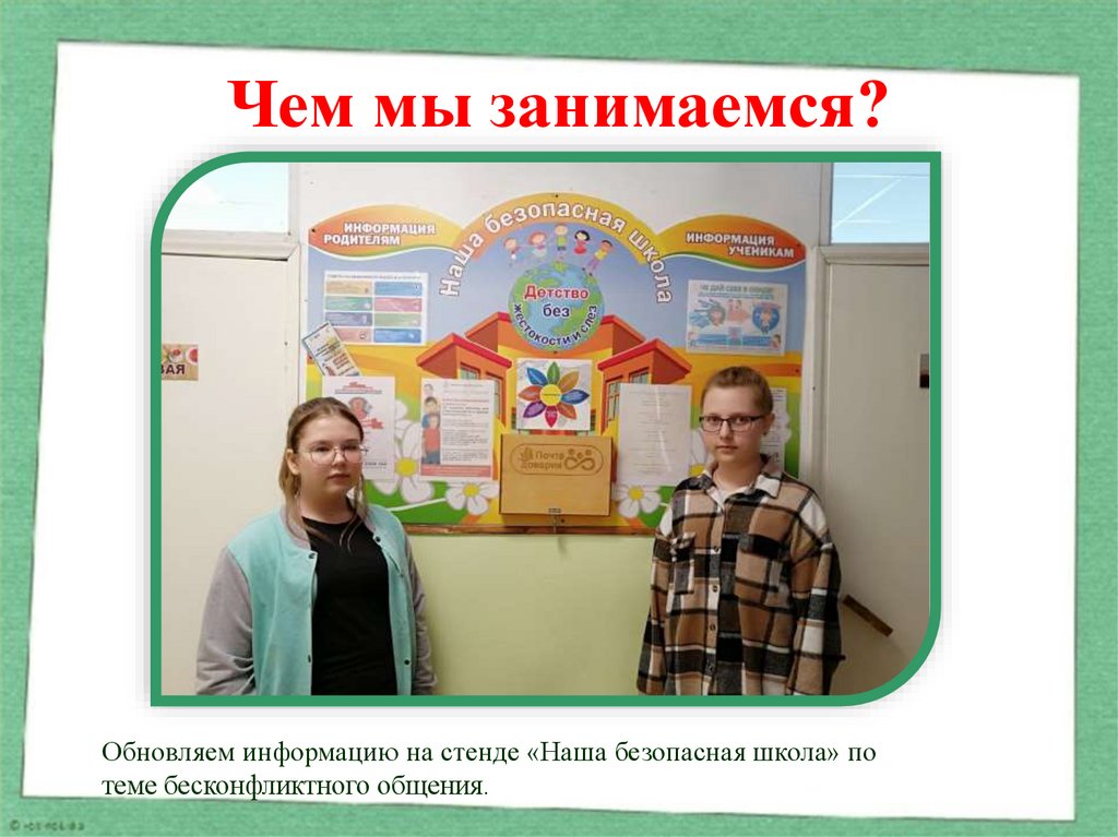 Чем мы занимаемся?Обновляем информацию на стенде «Наша безопасная школа» по