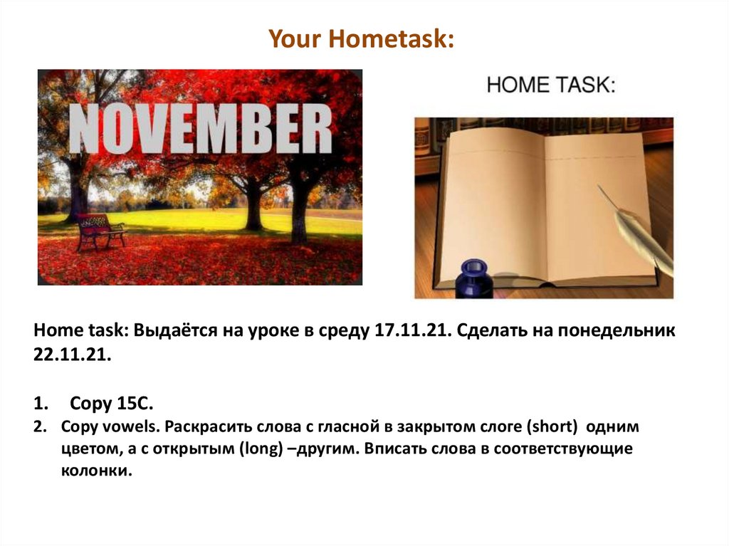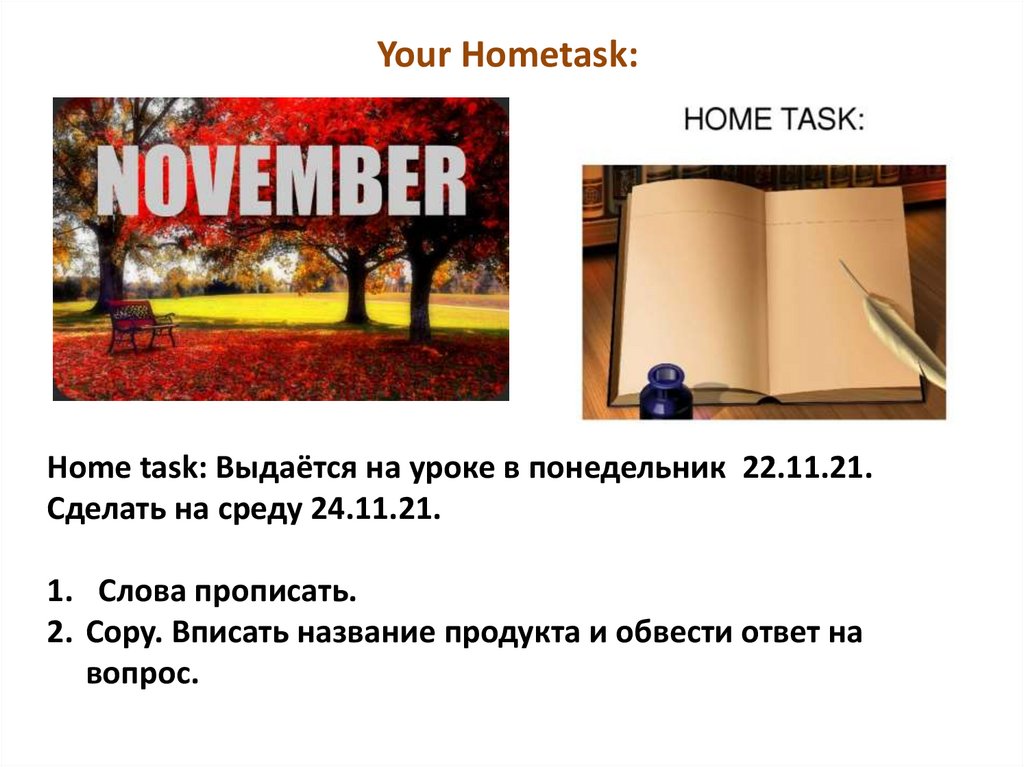Your Hometask:Home task: Выдаётся на уроке в среду 17.11.21. Сделать на понедельник