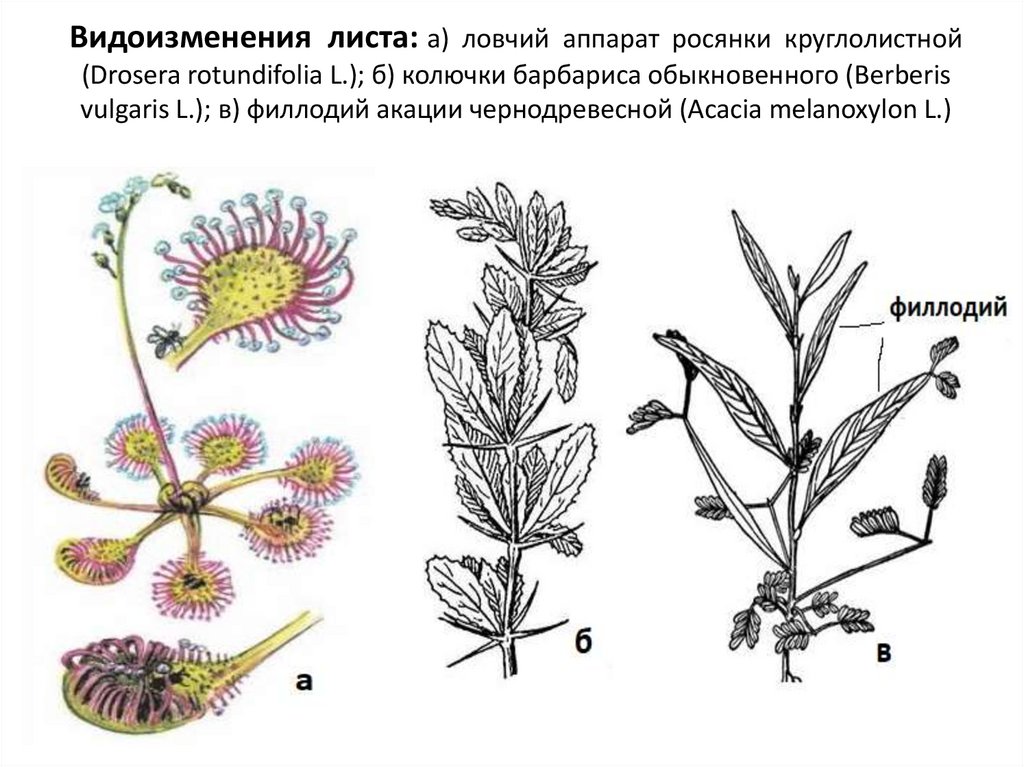 Видоизменения листа: а) ловчий аппарат росянки круглолистной(Drosera rotundifolia L.); б) колючки барбариса обыкновенного (Berberis