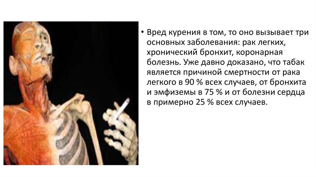 • Вред курения в том, то оно вызывает триосновных заболевания: рак легких,