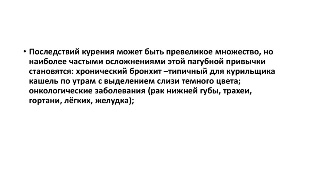 • Последствий курения может быть превеликое множество, нонаиболее частыми осложнениями этой пагубной привычки