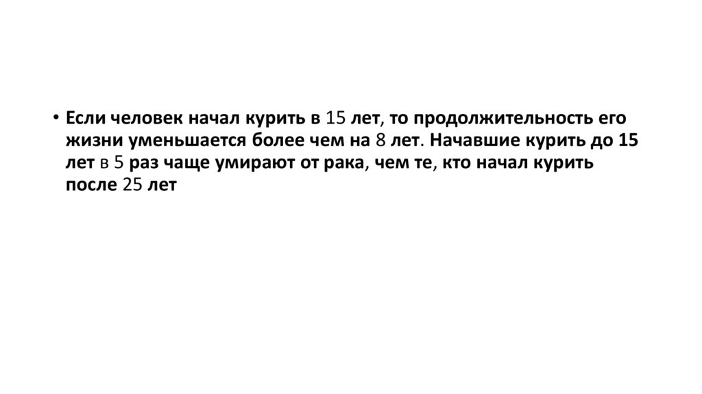 • Если человек начал курить в 15 лет, то продолжительность егожизни уменьшается более чем на 8 лет. Начавшие курить до 15