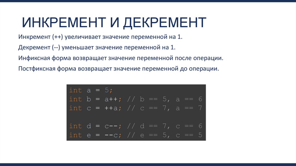 ИНКРЕМЕНТ И ДЕКРЕМЕНТИнкремент (++) увеличивает значение переменной на 1.