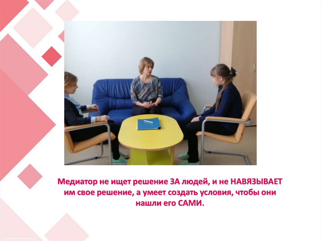 Медиатор не ищет решение ЗА людей, и не НАВЯЗЫВАЕТим свое решение, а умеет создать условия, чтобы они