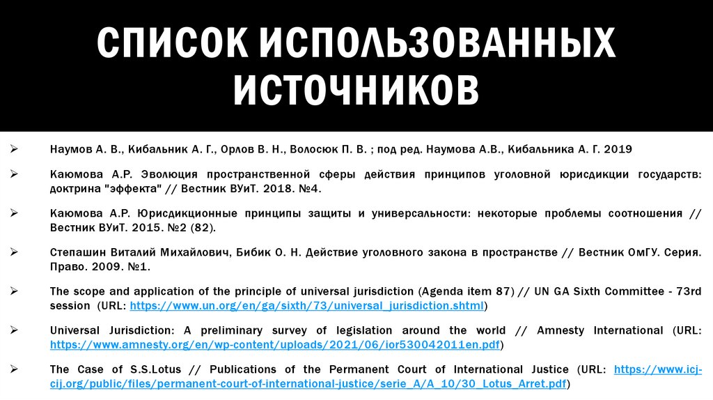 The Case of S.S.Lotus // Publications of the Permanent Court of International Justice (URL: https://www.icjcij.org/public/files/permanent-court-of-international-justice/serie_A/A_10/30_Lotus_Arret.pdf)