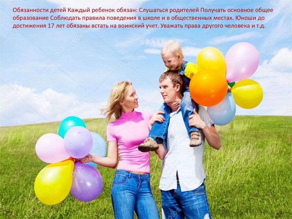 Обязанности детей Каждый ребенок обязан: Слушаться родителей Получать основное общееобразование Соблюдать правила поведения в школе и в общественных местах. Юноши до