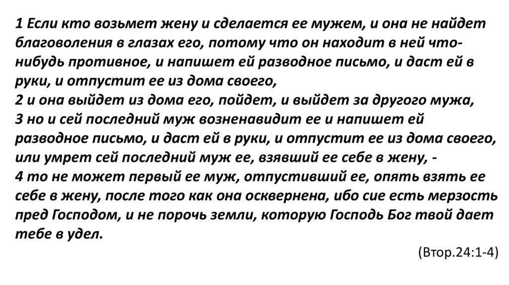 1 Если кто возьмет жену и сделается ее мужем, и она не найдетблаговоления в глазах его, потому что он находит в ней чтонибудь противное, и напишет ей разводное письмо, и даст ей в
