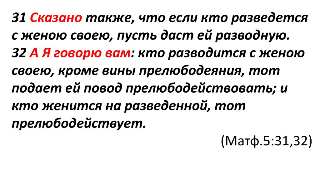 31 Сказано также, что если кто разведетсяс женою своею, пусть даст ей разводную.